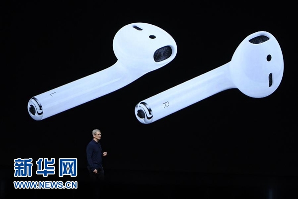 iPhone 7发布会上公布的无线耳机AirPods。(图片来源:新华网)