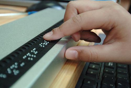 一名盲人儿童通过点显器进行电脑操作。(图片来源:刘军喜/新华社)