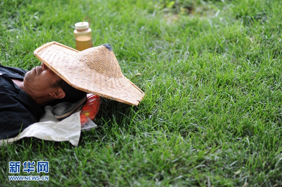 在济南市泉城广场,一位市民躺在草坪上睡觉。(图片来源:新华网)