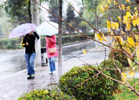 在哈尔滨,行人漫步在秋雨中。(图片来源:李勇/新华网)