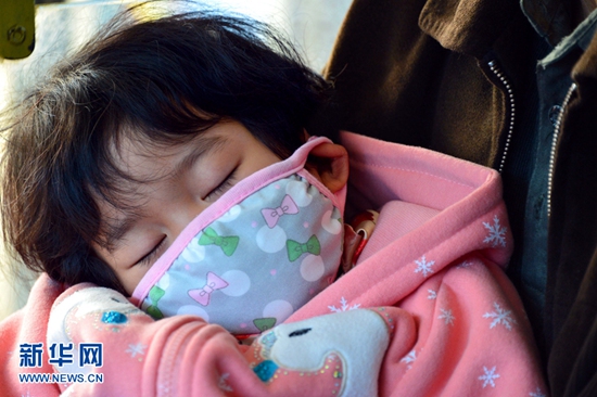 在济南市42路公交车,一位小朋友躺在爷爷的怀里睡觉。(图片来源:新华网)