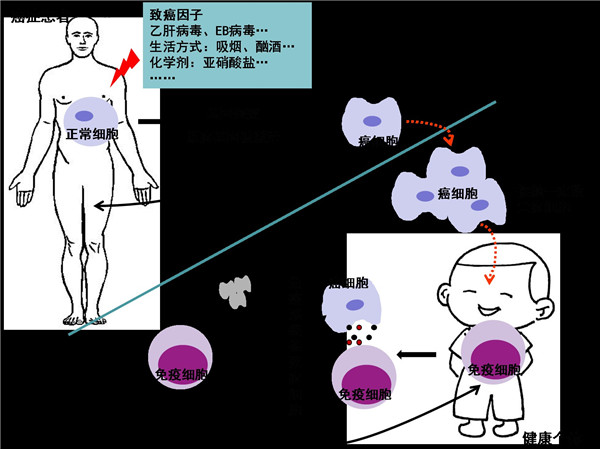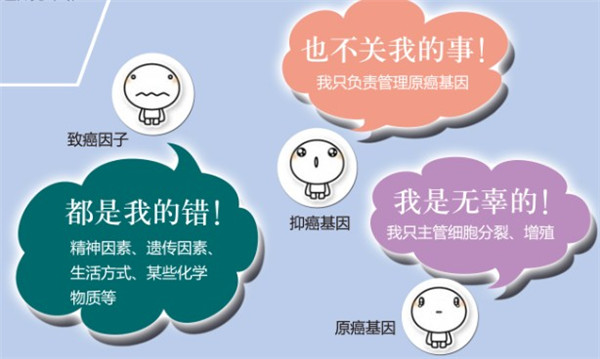 同时,为了管束原癌基因,机体内还有抑癌基因。原癌基因和抑癌基因相互牵制,维系平衡。但在致癌因子的作用下,两者间的平衡打破,诱导产生癌细胞。因此,致癌因子才是开启癌细胞的钥匙,它包括精神因素、遗传因素、生活方式、某些化学物质等。
