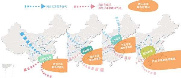 长江中下游地区处在欧亚大陆东部的中纬度,一方面受到从寒带南下的冷空气影响,另一方面又受到从热带海洋北上的暖湿空气影响。每年从春季开始,暖湿空气势力逐渐加强,从海上进入大陆,先至华南地区,嗣后进一步增强北移,到了初夏常常伸展到长江中下游地区,有时还可到达淮河及其以北地区。