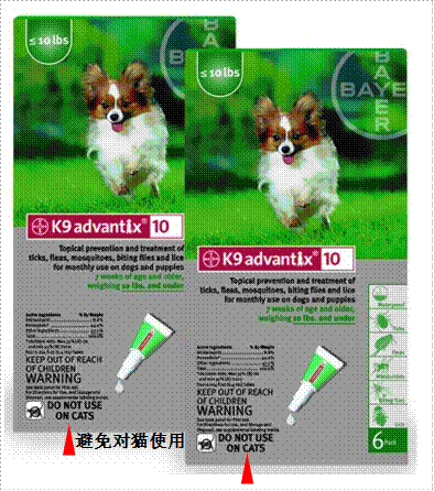 (K9 Advantix®系列犬用驱虫滴剂主要有效成分为吡虫啉、二氯苯醚菊酯和吡丙醚,商品在外包装上注明有“避免对猫使用”字样。)