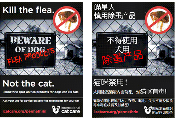 (由国外爱猫组织制作的提醒铲屎官们避免犬用除虫滴剂用于猫咪的海报)