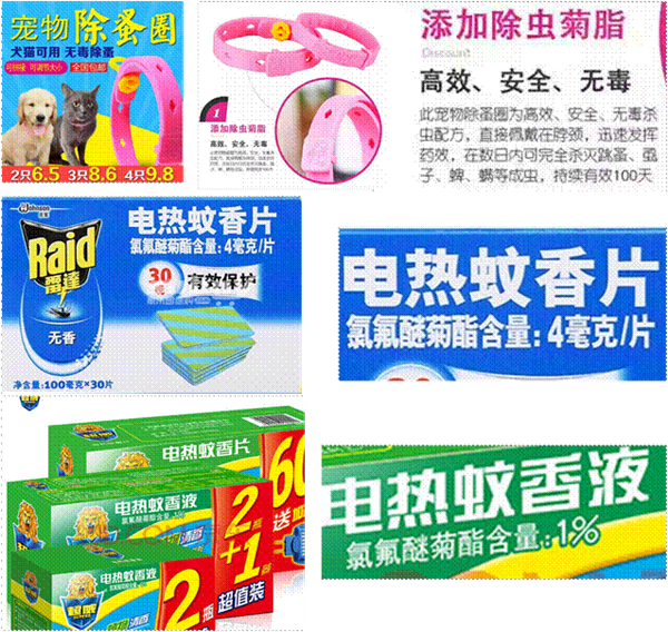 二氯苯醚菊酯(Permethrin)又称苄氯菊酯/扑灭司林/百灭宁/氯菊酯,氯氰菊酯(Cypermethrin)又称又称灭百可、安绿宝等,二者都是盘式蚊香、电蚊香中常用的驱蚊物质之一。