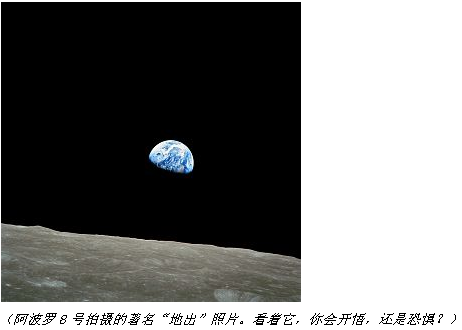 在用一根拇指遮住地球后,阿姆斯特朗曾说到一种“神秘产生的惊奇”。同样登过月的Shepard为此哭过,他说:“你知道了,所有人都在那儿,他们和你一样……你认识到,你只是那芸芸众生的一小块。”