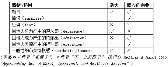 敬畏的起因是浩大与顺应的需要,这也就因此区别于一系列相似的情绪: