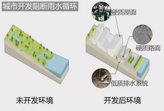 在原始自然条件下,大部分雨水由地面吸收并渗入地下,然后由地表蒸发再回归大气,多余的部分则从地表汇集形成溪流汇入江河湖海,但是城市的开发建设使得雨水无法渗入地下,阻断雨水循环,也破坏了地下水的有效收集。