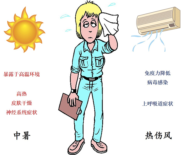 首先,二者成因不同。中暑通常是在高温下连续活动之后产生的急性症状,而热伤风的病情则会有个逐渐发展的过程,因为病毒的繁殖需要时间。