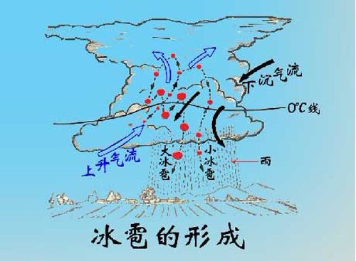 冰雹的形成:积状云——冰雹云——冰雹核心——冰雹