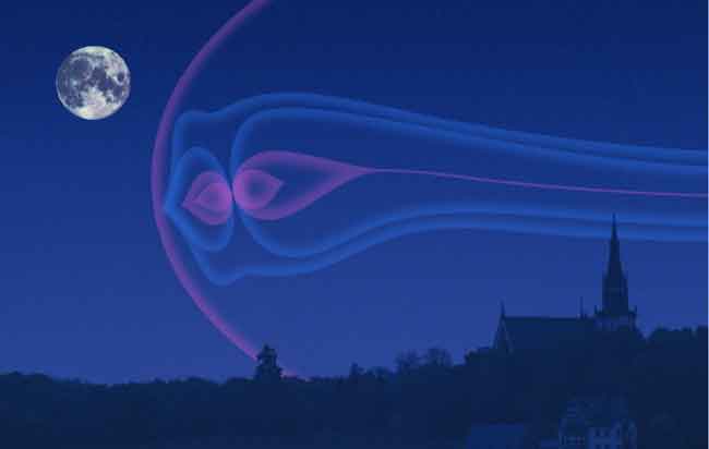 即使错失成为恒星的机会,木星也足以让人恐惧:它外核的液态金属氢电流赋予了它强大的磁场(磁矩为地球的2万倍),仿佛在太阳风的洪流中撑起了一把巨伞。这把叫做“木星磁层”的彗状巨伞其形之巨,足以装下数个太阳,其长尾甚至远及4个天文单位(6亿公里)外的土星轨道——这使的木星磁层成为太阳系中,除太阳风在星际介质中淘出的气泡“日球层”之外,最大的连续结构。如果我们能在地球上目视木星磁层,我们会发现它比日月盘面还要大5倍以上。