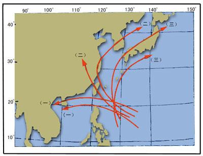 台风路径尽管是千变万化的,但是在相似形势和条件的影响下,还是有其共同的特征。根据它们的主要特点,可以将西太平洋台风的基本路径概括为以下三类: