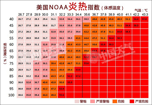 美国NOAA综合考虑了温度和湿度对人体感温度的影响,提出了炎热指数的概念。