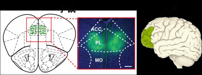 绿色荧光区域分别为小鼠及对应人类的大脑mPFC区域,图片来自论文1。