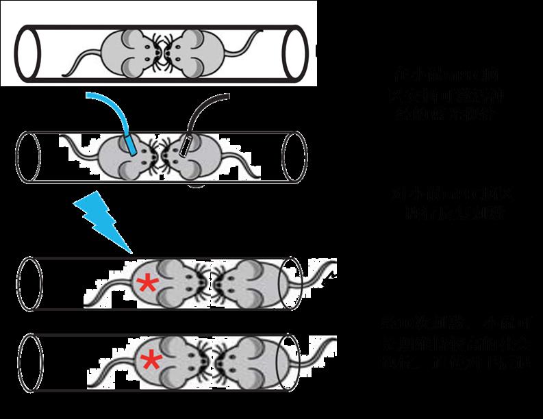 小鼠“钻管测试”中,研究人员将两只小鼠分别从管道两边进入,当小鼠碰面时,社会等级更高的小鼠会迫使对方用后退的方式退出管道,使自己得以顺利通过。如果两只小鼠的社会地位相当,它们将在管道中发生争斗,直至某一方获胜。胡海岚团队的工作发现激活mPFC区可以显著提高小鼠战胜对手、顺利通过管道的概率。