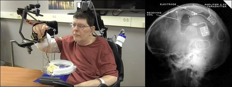56岁的瘫痪病人Bill Kochevar通过手术方法在脑内安插了芯片,并与电脑相连。电脑接收到来自脑部的数据后,会对脑电波进行解码,并带动躯体做出相应运动。如图为Bill利用脑机接口技术带动右手臂就餐。