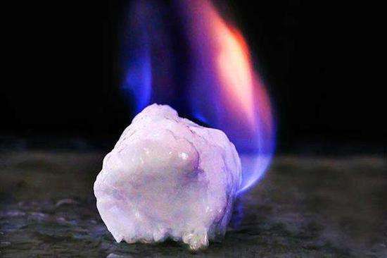 可燃冰,学名天然气水合物,也称气体水合物,是由天然气与水分子在高压(>100 大气压或>10MPa)和低温(0~10℃)条件下合成的一种固态结晶物质。因天然气中80%~90%的成分是甲烷,故也有人叫天然气水合物为甲烷水合物。天然气水合物多呈白色或浅灰色晶体外貌类似冰雪,可以像酒精块一样被点燃,故也有人叫它"可燃冰"。
