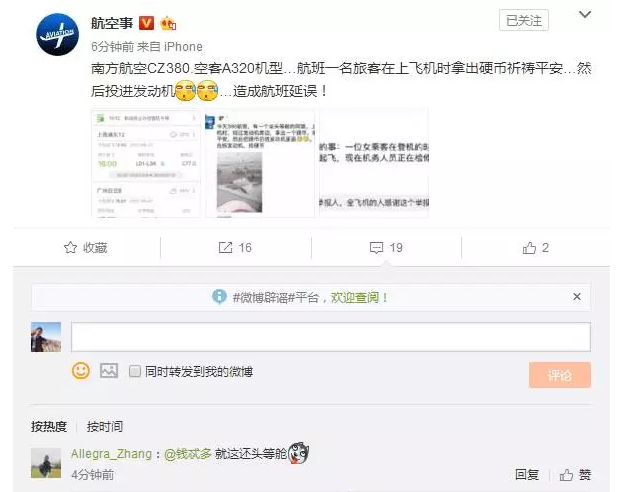 6月27日,在上海浦东机场发生了一件令乘客哭笑不得的事,一名年过八旬的老太太登机过程中朝飞机发动机抛了一把硬币,机务人员紧急进行检查,最终致使南航CZ380航班延误5小时。有乘坐该航班的乘客发微博吐槽此事,调侃道,老太太这是上飞机前的祈祷吗?