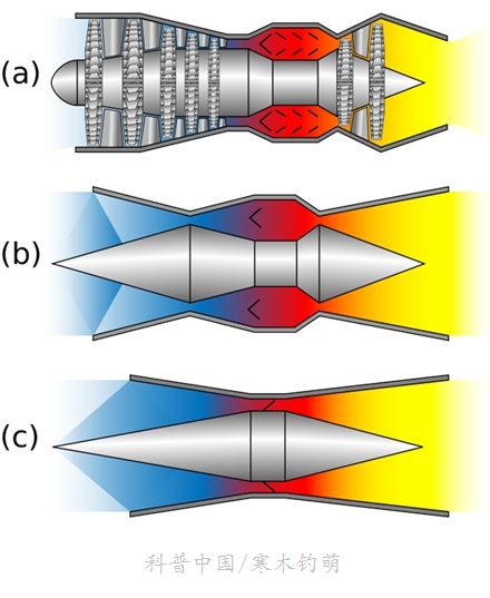 图中的(a)代表传统的涡喷发动机,其结构很复杂,而(b)代表冲压发动机;(c)表示超燃冲压发动机 GE36桨扇发动机示意图(动图) 涡轮螺旋桨喷气发动机,简称涡桨发动机(动图) 涡轮风扇发动机简称涡扇发动机(动图)