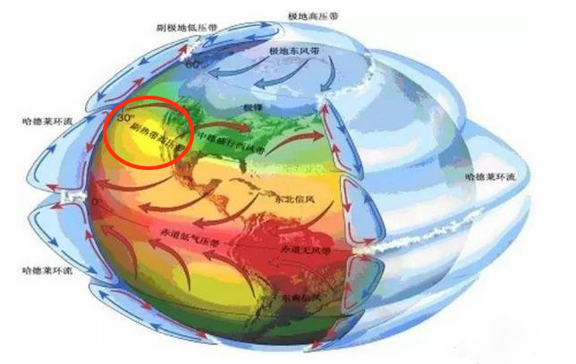 它出现在南北两半球副热带地区。在北半球,副热带高压随着太阳直射点的北移而缓慢向北移动。