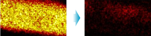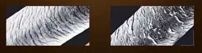 这个实验采用特殊装置,确认了头发表面硅元素的分布状况。左图是用了含硅洗发露又用了护发素后的照片,右图是再用含硅洗发露清洗一次后头发表面的照片。金色发亮的就是硅成分。用含硅护发素后残留的硅成分,用洗发露可以很干净的洗掉,也就是说并不会残留到头发上。