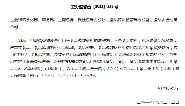 关键还是要看塑化剂有多少量,原卫生部551号文件规定了食品中三种典型塑化剂的临时管理限值,包括DEHP、DINP和DBP。