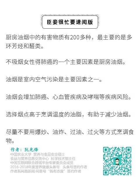 做饭后,媳妇跟我吐槽得最多不是洗菜有多麻烦、切菜有多危险、做菜有多难,而是油烟太呛人,尤其是在北京的头几年,我们住的出租房里油烟机也不是很好。其实,油烟除了呛人,它的危害可能比我们想象的要多得多。在美味的掩饰下,油烟正在悄悄侵害我们的健康。一份流行病学调查显示,烹调油烟已经成为我国妇女肺癌的主要非吸烟因素之一;不吸烟女性得肺癌的一个主要因素就是油烟。那么,厨房油烟是怎么形成的?它到底有哪些危害物质?对我们的健康有哪些影响?如何减少油烟?今天我们来聊聊厨房油烟。01