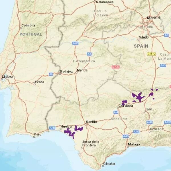 伊比利亚猞猁仅分布在紫色区域内。图片:BhagyaMani / wikimedia commons