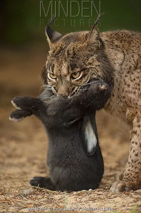 如同加拿大猞猁钟爱雪鞋兔一样,伊比利亚猞猁的食谱中80%以上的猎物是穴兔,也就是家兔的野生祖先。根据猎物的数量多少不同,它们也会偶尔尝试小型的有蹄类、鸟类和啮齿类动物,甚至动物尸体。一只成年猞猁需要平均每天捕食一只兔子,带着幼崽的雌性个体则需要抓到三只左右。