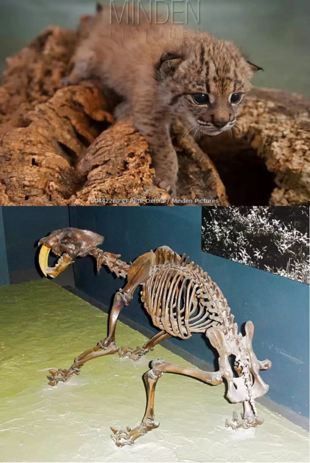 伊比利亚猞猁幼崽与剑齿虎化石骨架。图片:Pete Oxford / Minden Pictures ; wikipedia