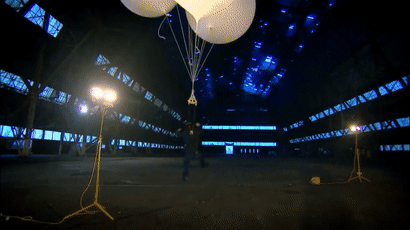 首先,就是给Greg Foot身上绑好氢气球,氢气球可以提供拉升力,从而对抗地球重力。