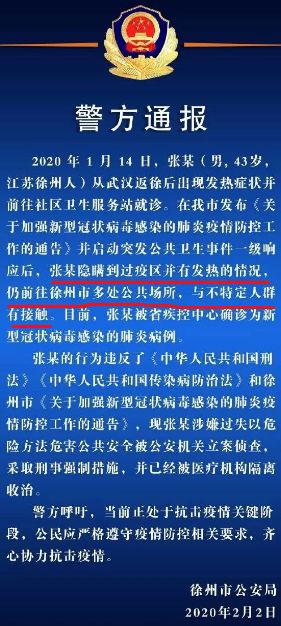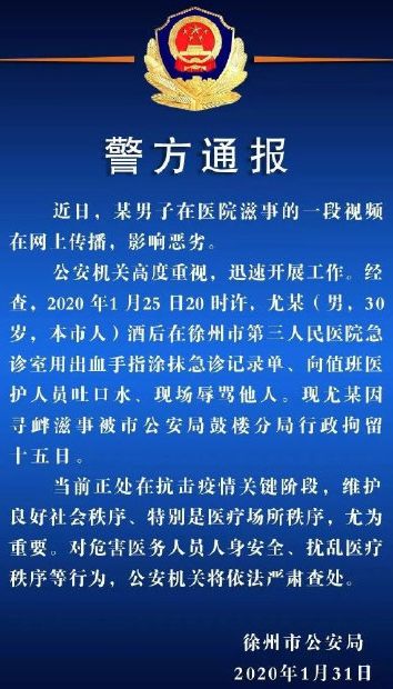 1月31日晚,徐州警方发布通报:2020年1月25日20时许,尤某(男,30岁,本市人)酒后在徐州市第三人民医院急诊室用出血手指涂抹急诊记录单、向值班医护人员吐口水、现场辱骂他人。