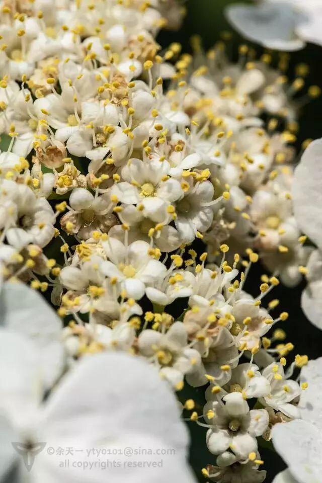 在吸引传粉者的时候,荚蒾属大多数种类都采用了“花”海战术,将较小的花朵凑在一起形成一个较大的花序增加面积,使花朵更加醒目的同时还比较节约能量。