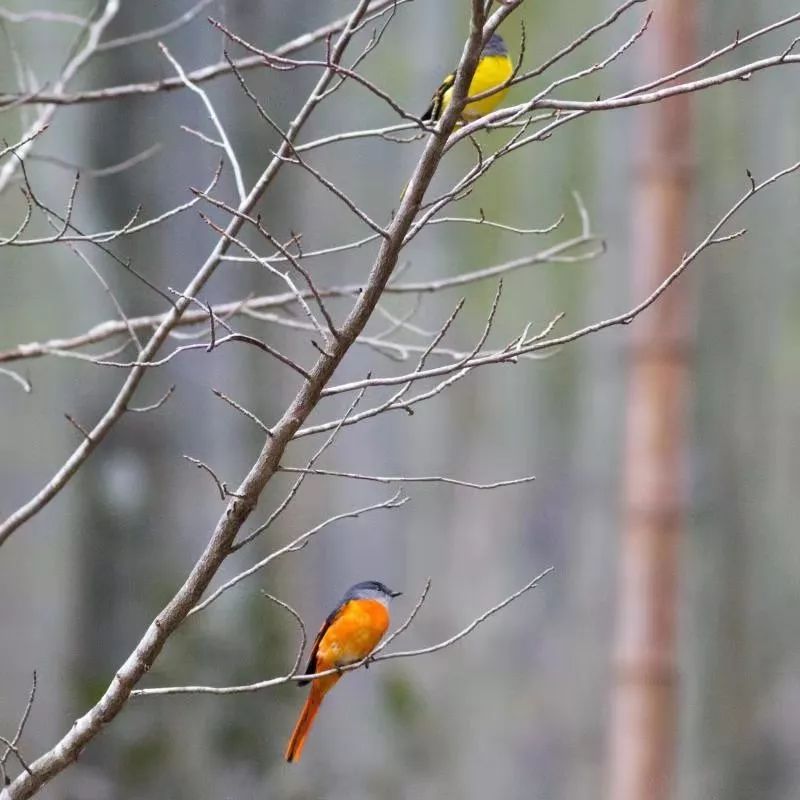 白鹇们完全没有匆忙离去的意思,太阳已经照到了宽阔的山谷,一大群灰喉山椒鸟感受到暖意,从林中不知道什么地方拥挤到我们面前,红色的雄鸟和黄色的雌鸟热切地讨论着,突然一跃而出,像一股双色的旋风从山谷一端刮到另一端,带走了山谷的雾气。