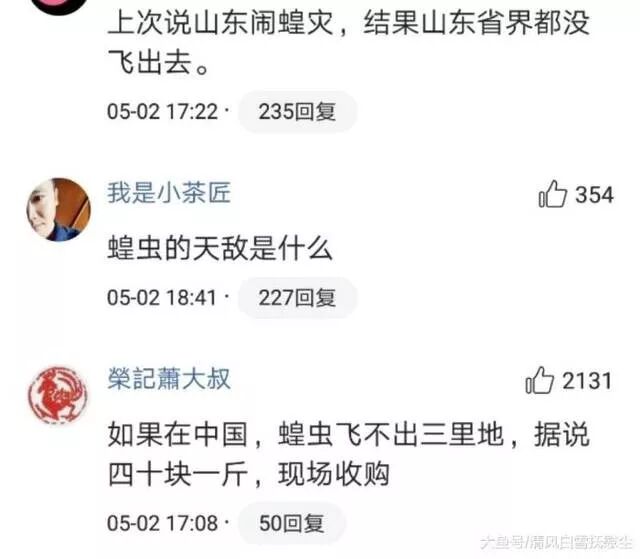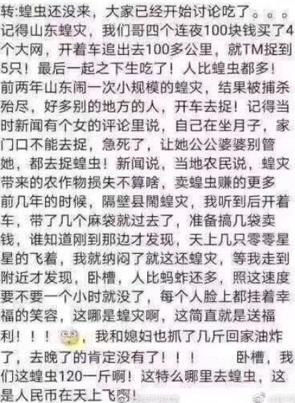 因此吃蝗虫看起来确实是控制蝗灾的手段之一,网上甚至流传着“蝗虫出不了山东省”的笑话。