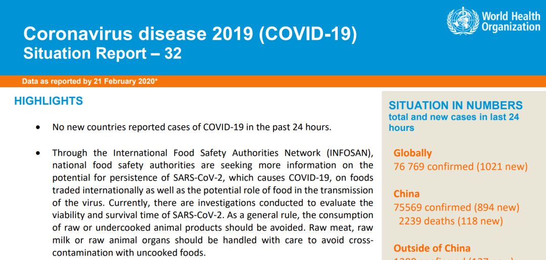 2月21日,世界卫生组织发布一份文件,对新冠病毒通过食品传播的可能性给出了官方意见及针对性的建议。这里将核心观点梳理并解读如下,供有关疫情防控机构、餐饮经营单位和家庭参考。1、尽管有人担心新冠病毒通过食物传播,尤其是生的动物性食物,但到目前为止并没有这方面的证据。各国食品安全官方机构正紧密合作,密切关注并搜集相关信息加以评估。但根据SARS和MERS(中东呼吸综合征)的研究经验,冠状病毒并不通过食物传播。2、有关冠状病毒的现有研究证据表明,它在低温条件下有较强的生命力,但保持卫生和正确的食品安全操作可以避免冠状病毒通过食物传播。基于这一点,请参考世界卫生组织提出的“食品安全五要点”,即:保持清洁、生熟分开、烧熟煮透,保持安全温度、清洁的水和食材。(文末有链接)3、冠状病毒的特点是不耐热,一般的烹饪手段(70度以上)足以杀死它们。因此需要强调的是,避免食用生的或半生的动物性食品。同时,生的动物性食物,包括肉、奶和内脏等,需要注意生熟分开,避免污染其他食物。4、根据SARS和MERS积累的经验,最常用的清洁消毒措施可以杀死冠状病毒,没有证据表明新冠病毒有任何不同。即便在食品或食品包装表面有新冠病毒,量也不会多,存活时间也不会长。这也意味着,接触食物或食物包装的表面后洗手就可以阻断潜在的病毒传播。