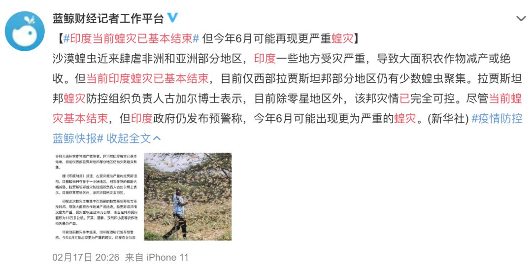 随后,印度于2月17日宣布,自家蝗灾已基本结束。中国网友一头雾水:传说中4000亿只蝗虫去哪儿了?怎么说消失就消失了呢? 首先我们要明白一点:迁飞过程中,蝗虫逐渐性成熟,会在落地时交配产卵,之后便很快死去。蝗虫成虫寿命本来就不长,飞着飞着蝗群数量就会变少,在人们紧急扑杀后,几乎消失。但是,它们沿途产下的无数卵不容忽视。 令人悚然的 “4000亿只蝗虫”还有另外一个版本“3600亿只蝗虫”。这两个数字可能是杜撰而来,联合国粮农组织(FAO)并未公布有这一数据。关于这两个数字究竟如何产生,也已经有媒体做了追溯,大家不妨看看。 01 蝗虫为什么会扎堆 这次蝗灾的元凶为沙漠蝗 Schistocerca gregaria,历史上给中国农业带来重创的则主要是飞蝗 Locusta migratoria 的一个亚种,它们都有三种形态:群居型、散居型及中间型(过渡型)。群居型总是寻求同类聚集而居,常在白天迁飞扩散,形成蝗灾;而散居型则躲避同类,孤单生活,只形成局部危害。 蝗虫的群居型和散居型可以相互转换。虫口密度越高,寄主植物越多,蝗虫越容易聚集成群居型,如沙漠蝗散居型个体在相互接触几小时后就可表现出群居型行为。触觉可以引起型变,如后腿股节外端受到四小时重复触觉刺激后,散居型沙漠蝗就会表现出群居型行为。 信息素也是一个十分重要的转化因素,它可将附近同种甚至不同种蝗虫都聚集起来,促使散居型转变为群居型,引起蝗灾爆发。蝗虫粪便、虫体、卵囊等都含有“召唤同伴聚集”的一系列信息素,如沙漠蝗粪便及体表挥发物中含有愈创木酚、邻二甲氧基苯和苯酚,三者同在时聚集作用最强,沙漠蝗们闻着味儿就会跑过来;飞蝗卵囊及表皮一些挥发物能将待产的雌性蝗虫们召集过来,集体产卵。 蝗虫信息素中还有一种重要物质——苯乙腈[jīng],它是沙漠蝗成虫聚集信息素的主要成分,但对若虫有一定抑制作用,可以使若虫更容易被农药杀死。但对飞蝗来说,苯乙腈并非聚集信息素,后来的研究发现,它可能是一种嗅觉警戒化合物——苯乙腈可进一步合成有毒的氢氰酸,蝗虫以此来防御天敌。 沙漠蝗也有类似的以毒御敌方法。比起散居型沙漠蝗,群居型沙漠蝗会通过食物,积累植物中的天仙胺,借此抵御天敌。 天仙子 Hyoscyamus niger。天仙胺多存在于茄科植物中,是它们抵御天敌的生物碱。图片:翦翳翎 在行为、内分泌、聚集信息、食物等因素作用下,蝗虫聚集成团。蝗群迁移过程中,越来越多蝗虫会加入进来,包括群居型、散居型,甚至其他种类蝗虫,像滚雪球一般越滚越大。 02 “漂洋过海”来抢饭 这次蝗灾并非突然发生,而是多代沙漠蝗共同“努力”的结果。沙漠蝗自古便是北非、西亚和印度等热带荒漠地区河谷和绿洲上的农业害虫。猖獗发生时,其扩散区可超过28万平方公里,波及65个国家全部或部分地区,约占全世界陆地面积20%和占世界人口10%的地区。 沙漠蝗甚至拿过一项吉尼斯纪录:最具破坏力的昆虫。沙漠蝗不喜欢潮湿之地,但降雨,尤其是久旱之后的降雨却是它们数量暴涨的契机——沙漠蝗的口粮(植物)在雨后开始大量生长,沙漠蝗可能因此进行集群迁飞。 2018年5月,阿拉伯半岛迎来飓风和降雨,蝗虫数量在6个月内暴涨400倍。若是以往,降雨过后,沙漠越来越干燥,植物逐渐减少,蝗群数量也会渐渐归于正常;可2018年10月,第二次飓风和降雨来袭;到了2019年3月,蝗虫数量估计增加8000倍。 数量暴涨的收割者们开始迁飞。蝗群先北上跨越波斯湾到达伊朗南部,然后向东挺进到印度西部和巴基斯坦。另一部分蝗虫在2019年夏天乘着强风南下,驻扎在也门,也门内战阻止了杀虫剂喷洒;2019年10月,沙漠蝗从也门跨越红海,到达非洲之角(埃塞俄比亚和索马里)。2019年12月,非洲之角迎来一场飓风和降雨。2019年末,沙漠蝗群继续南下至乌干达,并很快到达肯尼亚、坦桑尼亚等地。 同样的事情在1978年就发生过:沙特阿拉伯沙漠地区出现50多个蝗群,随着季风越过红海进入埃塞俄比亚和索马里;26个蝗群越过印度洋飞到印度、伊朗和巴基斯坦。 两次沙漠蝗造成最大损失都在非洲。此次蝗群至少造成1190万人面临严重粮食危机,2010万人面临潜在粮食危机。FAO还给出一个数据:“1平方公里能容纳约8000万只成年蝗虫的蝗群,它们一天的食物消耗量与3.5万人食物消耗量相当。” 03 山隔水挡,但也不能掉以轻心 很多人还担心:沙漠蝗会不会飞到中国来?其实,沙漠蝗到达中国的几率很小,但我们还是要做好防范工作。 这次沙漠蝗到达离中国最近的地方(印度西部和巴基斯坦),与我们隔着帕米尔高原和喜马拉雅山脉,这些地方大多终年积雪,沙漠蝗几乎不可能越过——沙漠蝗飞行海拔可达2000米,此后海拔再高,低温便会阻碍其飞行。但它们可经哈萨克斯坦等国进入中国新疆。哈萨克斯坦与新疆之间隔着天山等众多山脉,同时也有很多沙漠、绿洲、盆地等环境,足量沙漠蝗一旦到达新疆,就可能发生危害。截至目前,历史上从未在新疆发现沙漠蝗踪迹,但我们也不能因此疏于防范。 沙漠蝗也可从印度跨过孟加拉,再经由缅甸进入中国云南——就像2018年草地贪夜蛾入侵中国一样。沙漠蝗在历史上确实到达过缅甸,但它们没能进一步发育生长就死掉了。中国至今只由张学忠先生于1974年在西藏聂拉木县采到过一只雌性沙漠蝗散居型标本,此后再无记录。中国昆虫学家蔡邦华先生也于1956年记载“沙漠蝗在云南亦