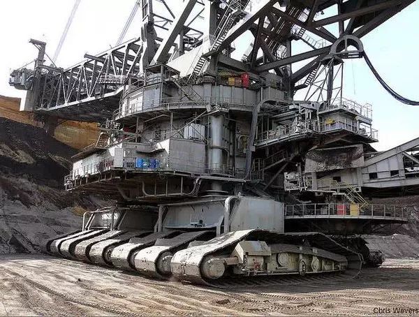 代号Bagger 293 的挖掘机体型庞大,轮子呈锯齿状,看起来像是世界末日这种噩梦般的场景中才会出现的机械。不过这些看起来很可怕的锯齿状轮子其实是由巨大铲斗组成的斗轮,工作时通过斗轮旋转来挖掘土石。Bagger 系列轮斗挖掘机有很多型号,都在大型的露天煤矿中作业。它们每天能挖数千吨的矿物,配以传送带、粉碎系统等机械装置,它们是现如今世界上效率最高的挖掘机械。