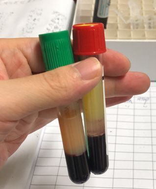 图示高脂血症的血样,可见血液分层,上层为脂肪
