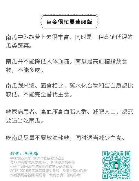 对于国人来说,南瓜最大的乐趣始终还是吃,清炒南瓜、蒸南瓜、南瓜饼都是人们最爱。民间也一直有人说,南瓜营养价值高,还能降血糖、减肥,比如,作为糖尿病人的我妈,就比较喜欢吃南瓜。还有不少人把南瓜当主食吃来帮自己减肥。不过,南瓜的营养到底如何?吃南瓜真的可以降血糖吗?南瓜可以替代主食吗?今天我们来聊聊南瓜。01