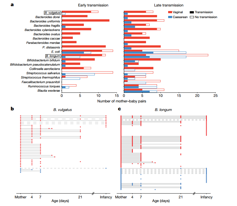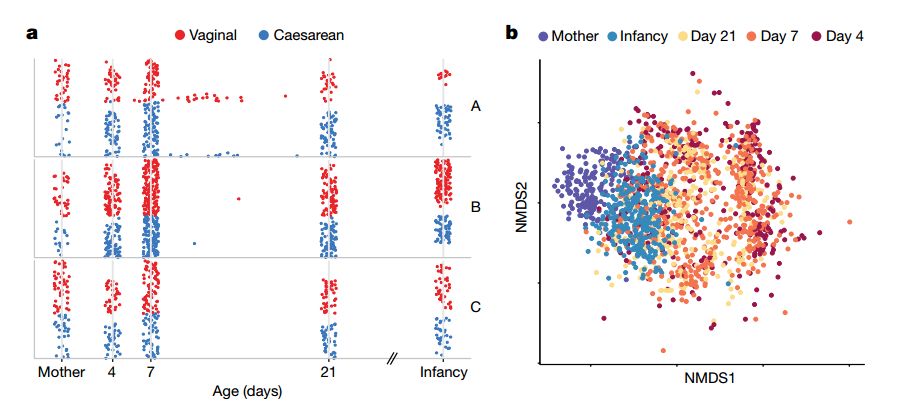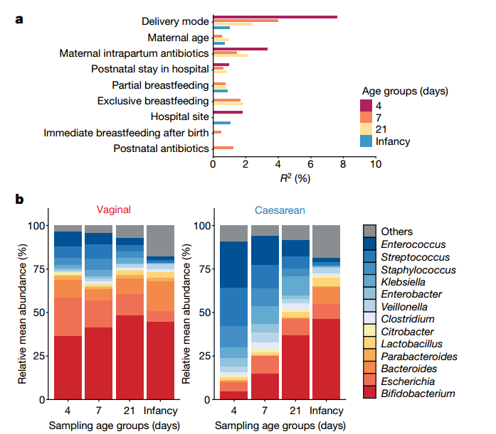 b. 经阴道分娩(左)和剖宫产(右)婴儿在出生后第4、7和21天时的肠道微生物构成