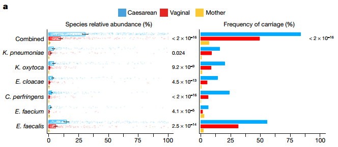经过分析发现,经阴道分娩的婴儿肠道内双歧杆菌属(长双歧杆菌、短双歧杆菌)、埃希氏菌属(大肠杆菌)、拟杆菌属(普通拟杆菌)和副拟杆菌属(狄氏副拟杆菌)丰度很高,占据了肠道微生物的68.3%(图2b左)。而这类菌群在剖宫产的婴儿肠道中则很少,主要是屎肠球菌、表皮葡萄球菌、副血链球菌、产酸克雷伯氏菌、肺炎克雷伯氏菌、阴沟肠杆菌和产气荚膜梭菌,这些菌都与医院环境和早产相关。出生后第4天,这些菌属占到婴儿总肠道微生物的68.25%(图2b右)。