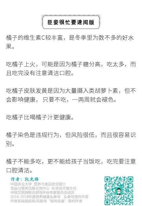 还有很多家长担心,现在的橘子都是染色的,毕竟之前网上也一直流传着橘子染色的视频。首先,即使是染色的,安全风险也很低。所有的色素、染料用量都很小,因为用多了就穿帮了。量少,健康危害就没多大。比如当年赫赫有名的苏丹红鸭蛋,后来评估发现,大约每天吃1000个才有可能有危害。不过,就算“吃了没事”也照样违法,我们还是应该严厉抵制这种行为。其次,桔皮的表面是油性的,就算想染色,染料也难以穿透。一般你用手摸一摸,如果手变红了,那就可能是涂了染料了,就走开、不买罢了。其次,吃橘子的时候,我们都要剥皮呢,染色最多也是表皮,果肉是进不去的,去皮再吃就没问题了。