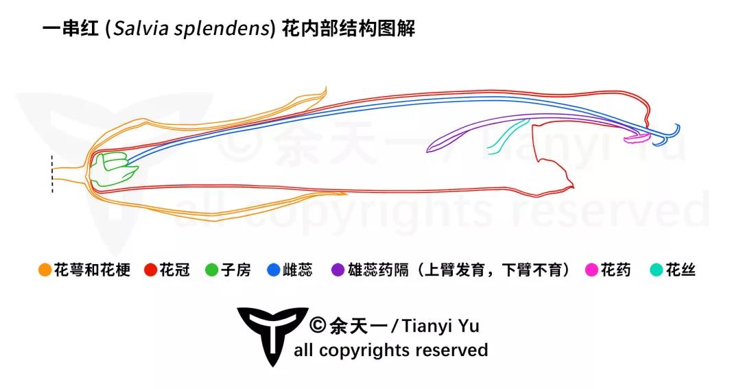 一串红花结构图解,主要展示雄蕊药隔的上臂和下臂。图片:余天一