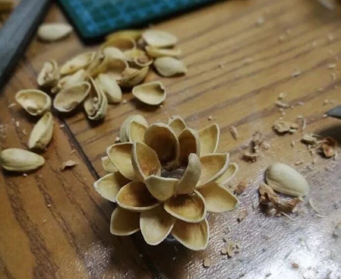 手工大神在非常时期找点事干的方式也十分脱俗,直接拿开心果壳做出了一个莲花形状的灯芯: