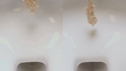 就像下图中,一坨黏糊糊的物体在滴落到马桶上后,直接滑落,动作流畅,无残留,对马桶一点眷恋都没有: