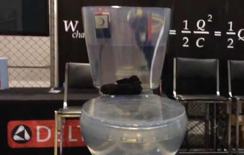 图中这个马桶出现于加利福尼亚州的一个展览会上,整体采用透明材料,水箱里的水清晰可见:
